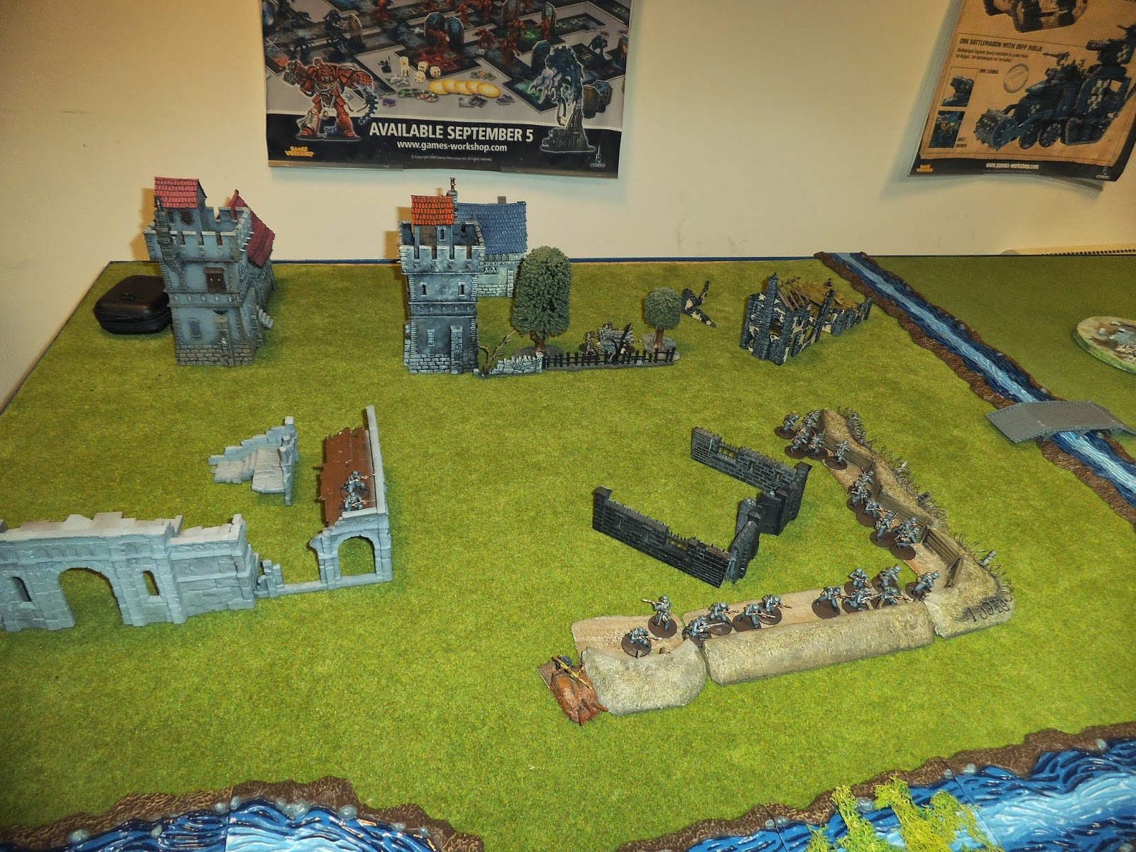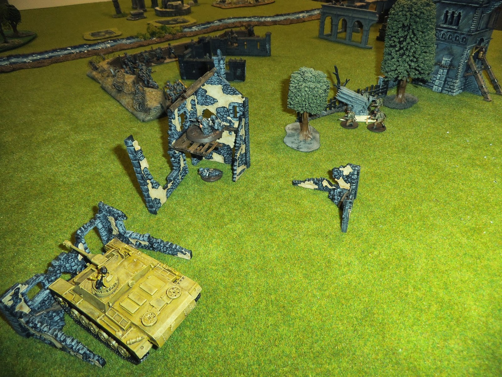 Here is our 8x6 table filled with terrain. The Soviets came in from the table edges at the back and to the right (from the picture's perspective). The German-British alliance was holding the village behind the river and could bring in reserves from the close and left edge.